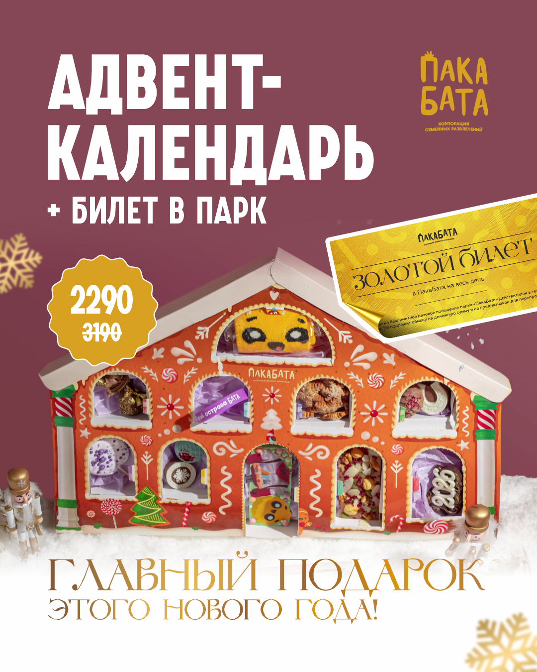 В ПакаБата стартовала новогодняя акция «Золотой билет» — это выгодное пакетное предложение, которое объединяет входной билет в парк и адвент-календарь.
